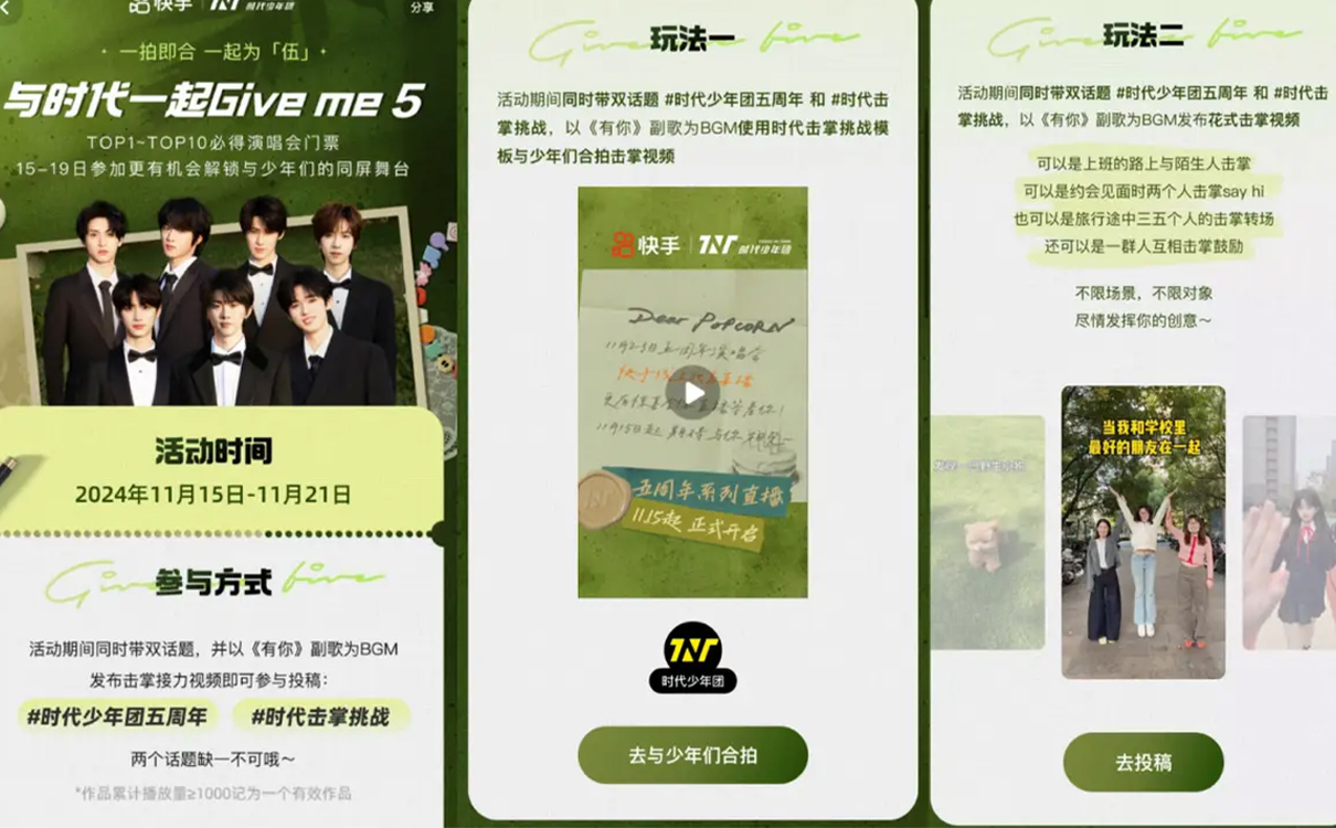快手也不遺餘力地推出票房與線(xiàn)上下單元的結合,力求為(wèi)觀衆們提供更優質(zhì)的視聽體(tǐ)驗。在這場五周年的慶典中(zhōng),粉絲們的參與感尤為(wèi)重要,大家可(kě)以通過“時代擊掌挑戰”參與互動,提交自己的擊掌視頻,與時代少年團共同點亮這場盛會的舞台。